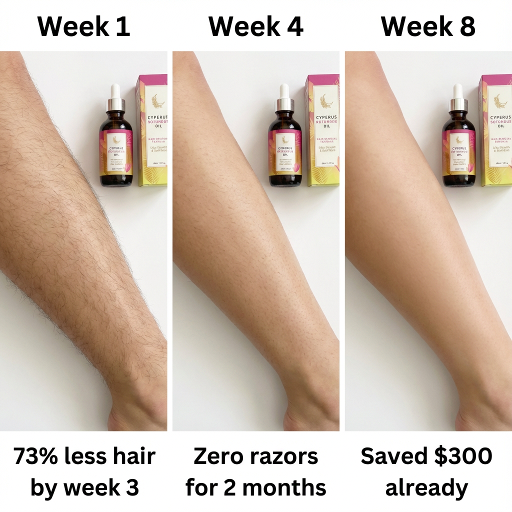 Our Cyperus Rotundus Oil contains natural compounds that block 5-alpha-reductase - the enzyme that triggers hair production in your follicles. Think of it like putting your follicles into "sleep mode." Unlike temporary methods that just remove surface hair, this actually disrupts the growth cycle at the root level, causing hair to grow back thinner, weaker, and eventually not at all.